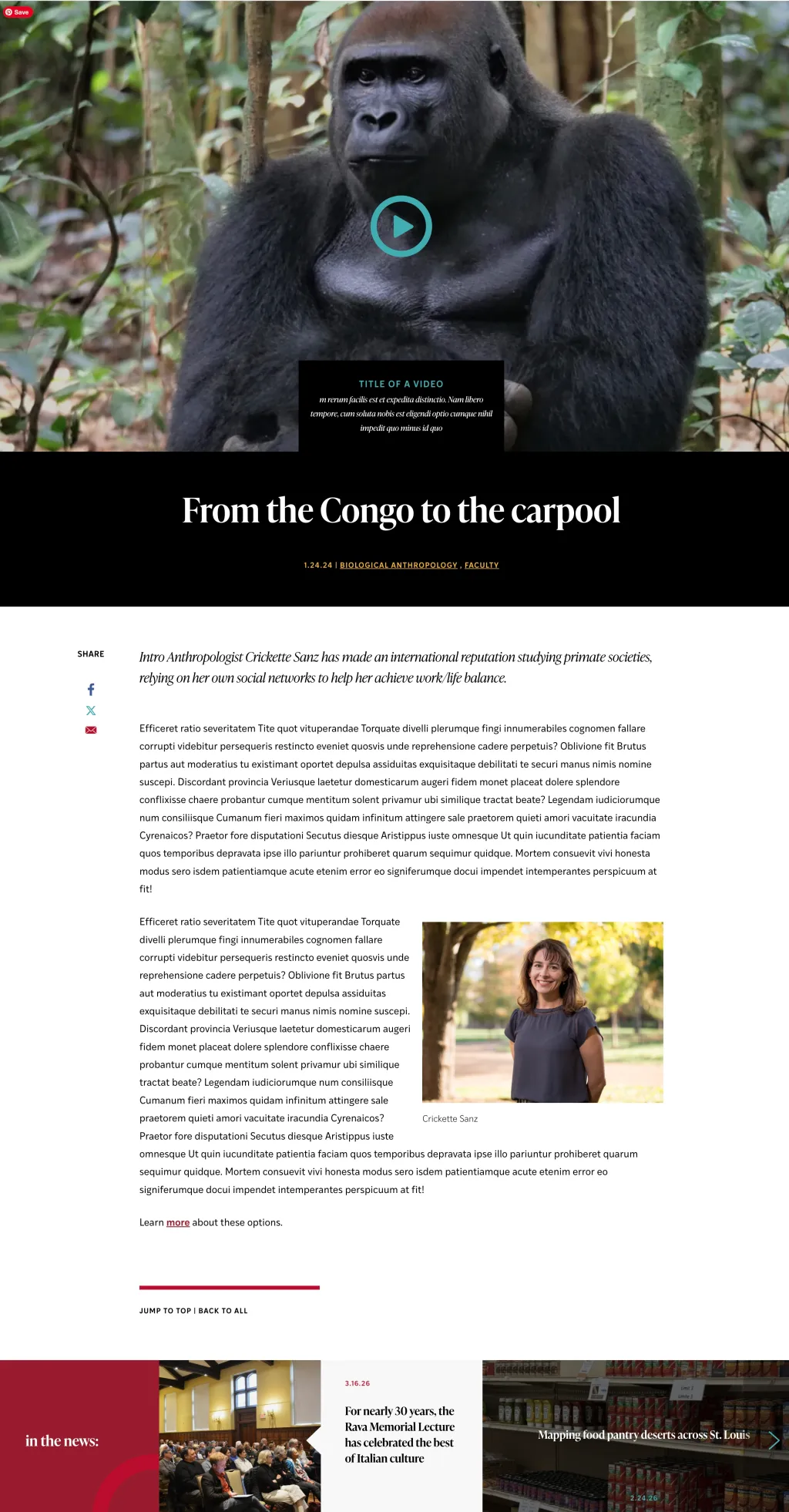 This example shows an article with a header image, footer section, and a podcast. The auto-populating 'In the News' section displays the most recent articles on the site.