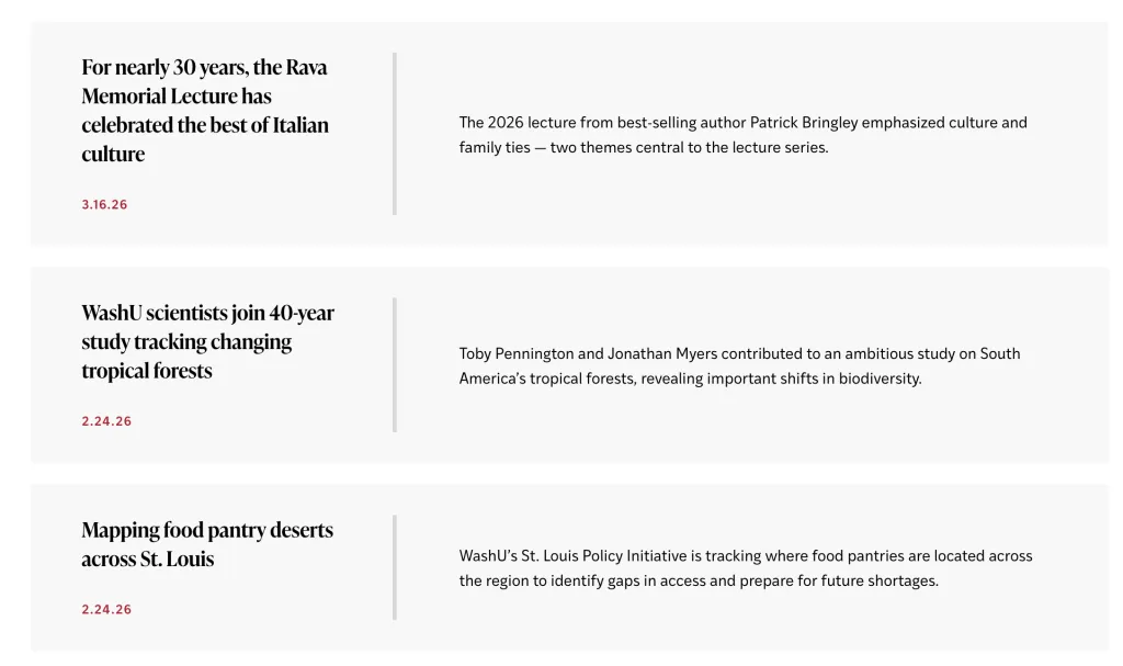 The News landing page can be set to display as a list (text) or as cards (images). If you would like to change your layout, you can contact the web team at artsci-webteam@wustl.edu