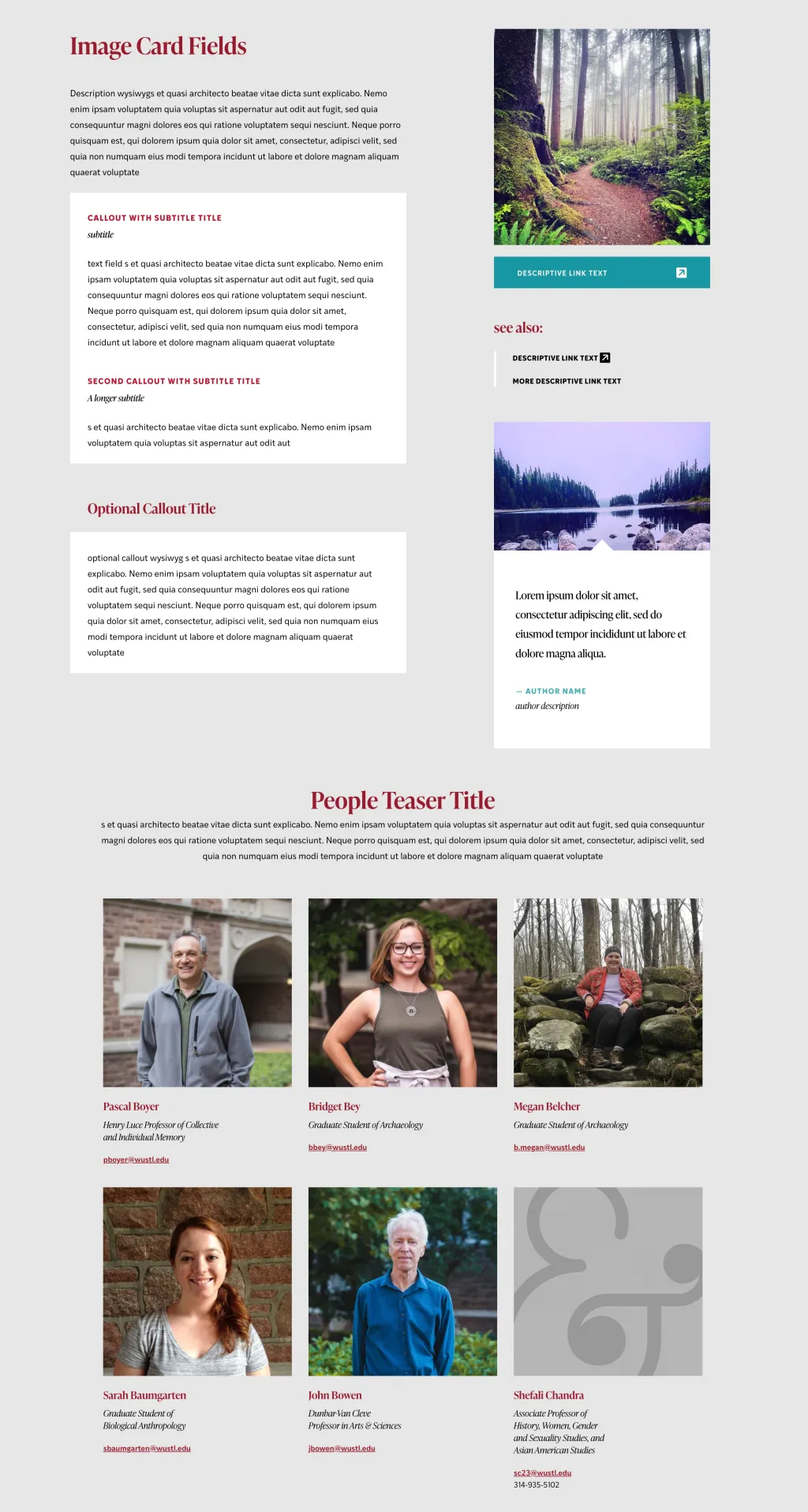This section allows you to choose from the person profiles on your site and pull them into the page as a teaser. Layout options include 1, 2, or 3-columns with either white or grey backgrounds. You may either select individual people or choose a taxonomy term to pull in all people with that tag. Be careful though- if you select people manually and select a taxonomy term then nothing will display. You must choose one method or the other but not both.