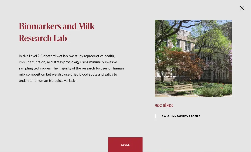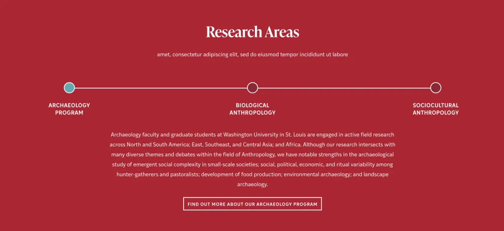 This section is helpful for illustrating areas such as program subsections or department majors and minors. At the top, there are fields for a title and subtitle. You can also add up to five dots and can choose between a red, grey, or white background color. As the user clicks on the dots, they see a brief overview of your program. They can click on an optional link to get more information.