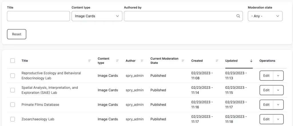 Unlike events and articles, you will need to edit your image cards through the 'find content' option in your admin bar. Once you pull up your list of image cards, you can click on the 'edit' link in the Operations column.