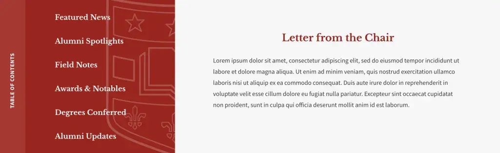 Need some inspiration? Here are a few examples of publication page layouts and what sections are being used in each one.
