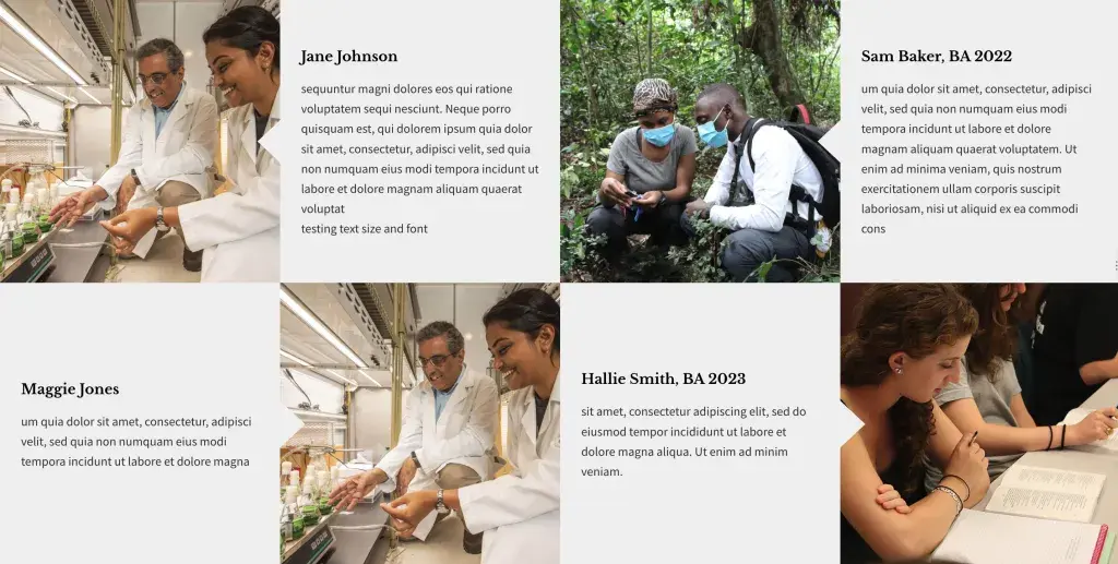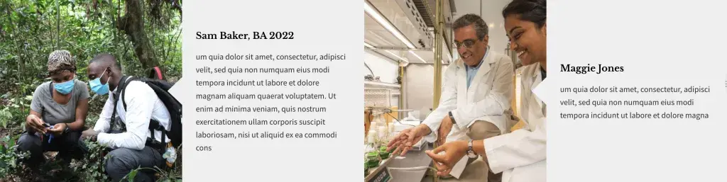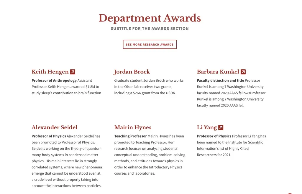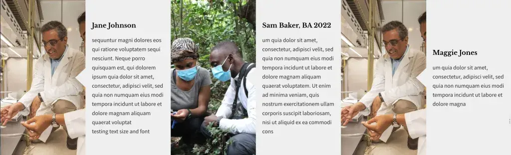 This section was designed with people in mind, but it can be used to display other kinds of content too. It does not pull from your site's existing Person pages but instead provides fields for entering a title, description, (required) image, and link.